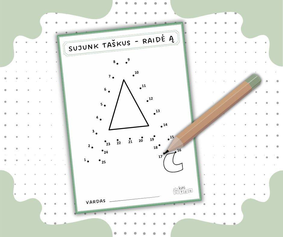„Sujunk taškus – išmok raides!“ – tai smagus ir lavinantis PDF užduočių rinkinys vaikams, kuriame kiekvienas puslapis skirtas vienai iš 32 lietuvių kalbos raidžių. Vaikas sujungęs taškus pagal skaičių eiliškumą, atras paslėptą raidę!