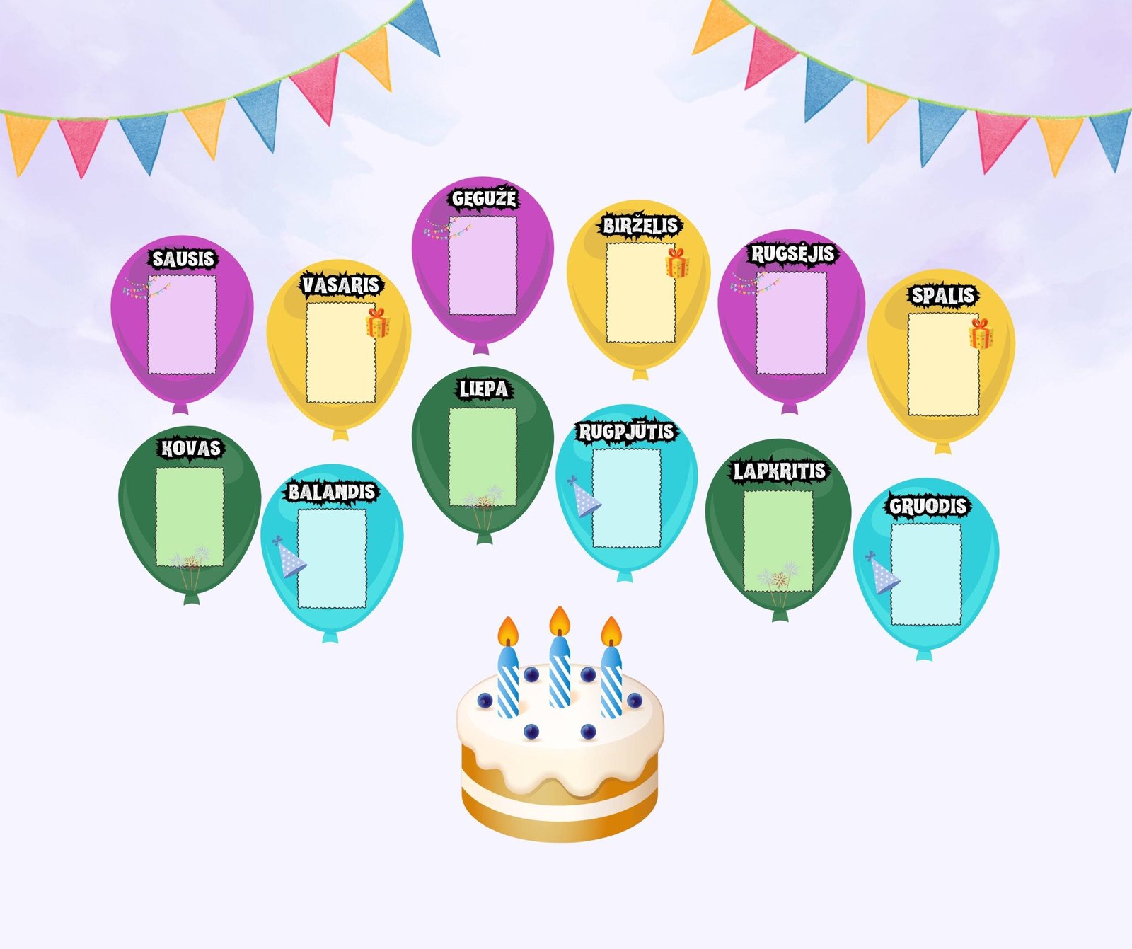 Kiekvienas mėnuo turi savo balioną, kuriame galite įrašyti vaikų vardus, datas ar priklijuoti nuotraukas.
