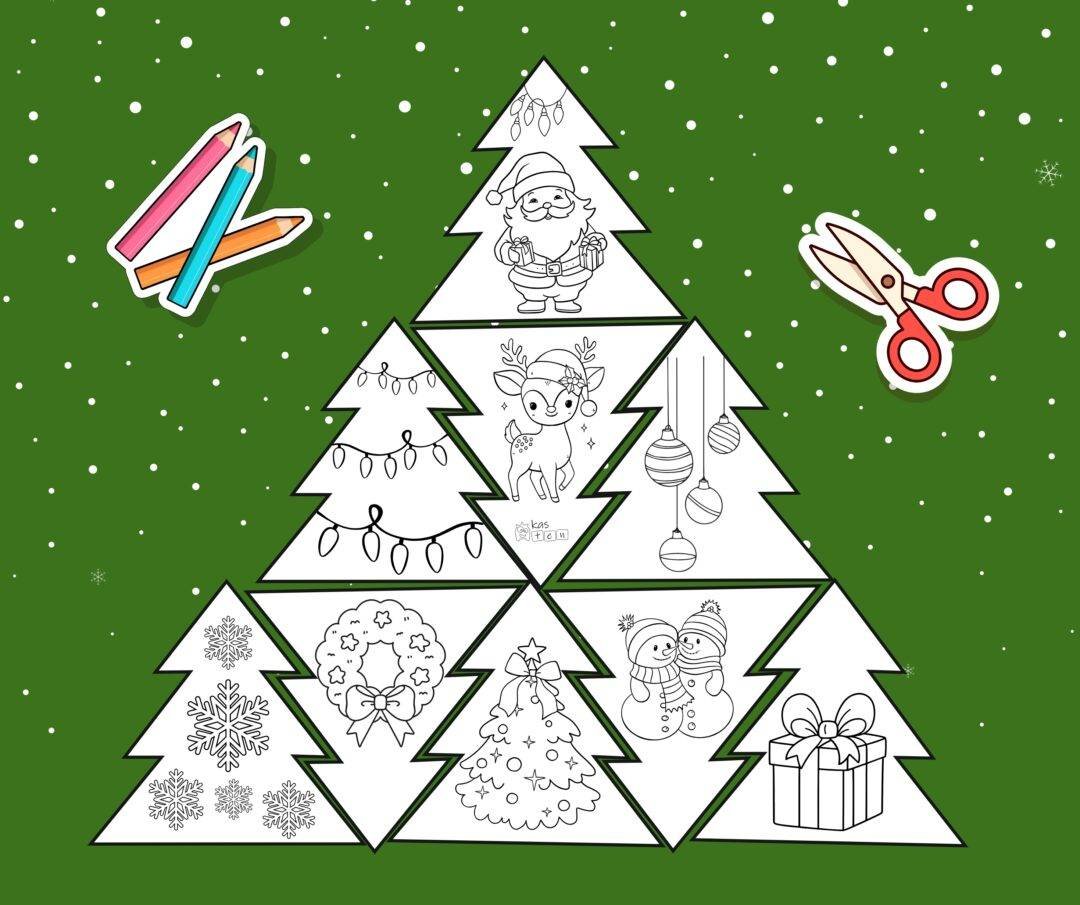 Spalvinimo ir karpymo užduotis vaikams – sudėliok savo kalėdinį medį! Puiki šventinė veikla ir graži dekoracija.