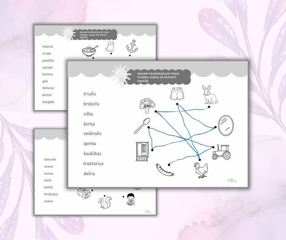 Šis spausdinamas PDF užduočių rinkinys lavina vaikų skaitymo įgūdžius, loginį mąstymą ir dėmesio koncentraciją. Vaikai turi sujungti paveikslėlius tokia tvarka, kokia jie pateikti sąraše.