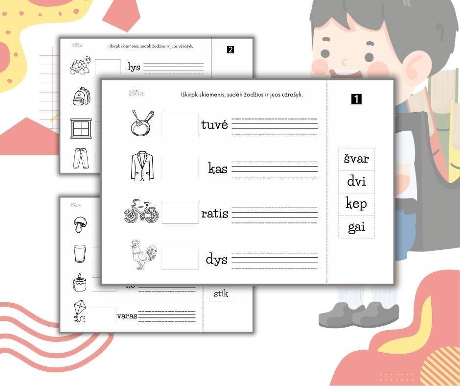 Tai praktiška skaitymo ir rašymo užduotis, kur vaikas išsikerpa skiemenis, parenka tinkamą skiemenį prie paveikslėlio, sudaro žodį ir jį parašo.