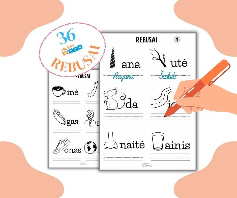 36 rebusai: vaikas pagal paveikslėlius ir pateiktas raidžių dalis sudaro žodį, jį perskaito ir parašo. Puikiai tinka priešmokyklinukams ir pradinukams.