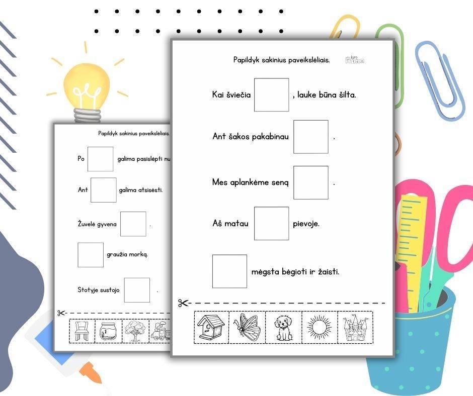 Tai praktiška skaitymo užduotis, kur vaikas perskaito sakinį ir parenka paveikslėlį, kuris geriausiai tinka į tuščią vietą.
